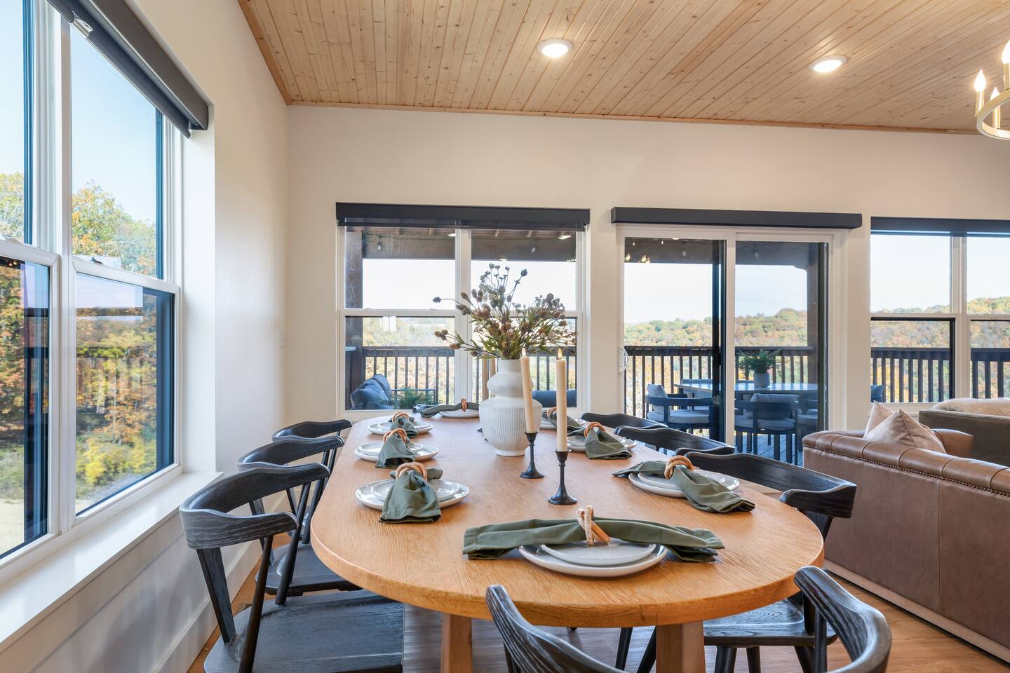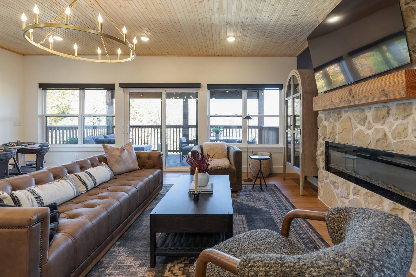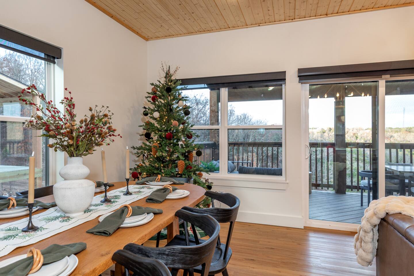The brand-new Red Door Lodge is a 4-bedroom home where modern comfort meets Ozark charm — and yes, the door really is red. It has EVERYTHING you need for a great family or group vacation in Indian Point of Branson, MO. ✔ 2 King + 2 Queen + 1 Full + 3 twin beds ✔ 1 Mile to Silver Dollar City ✔ Game Room with TV and Shuffleboard ✔ PS 5, Board Games, Kids Books ✔ 2 Decks (7-Seat HotTub, Outdoor Dining) ✔ Fully Stocked Kitchen ✔ Pack n Play and High Chair ✔ Pools ✔ EV Charger ✔ Outdoor Grill